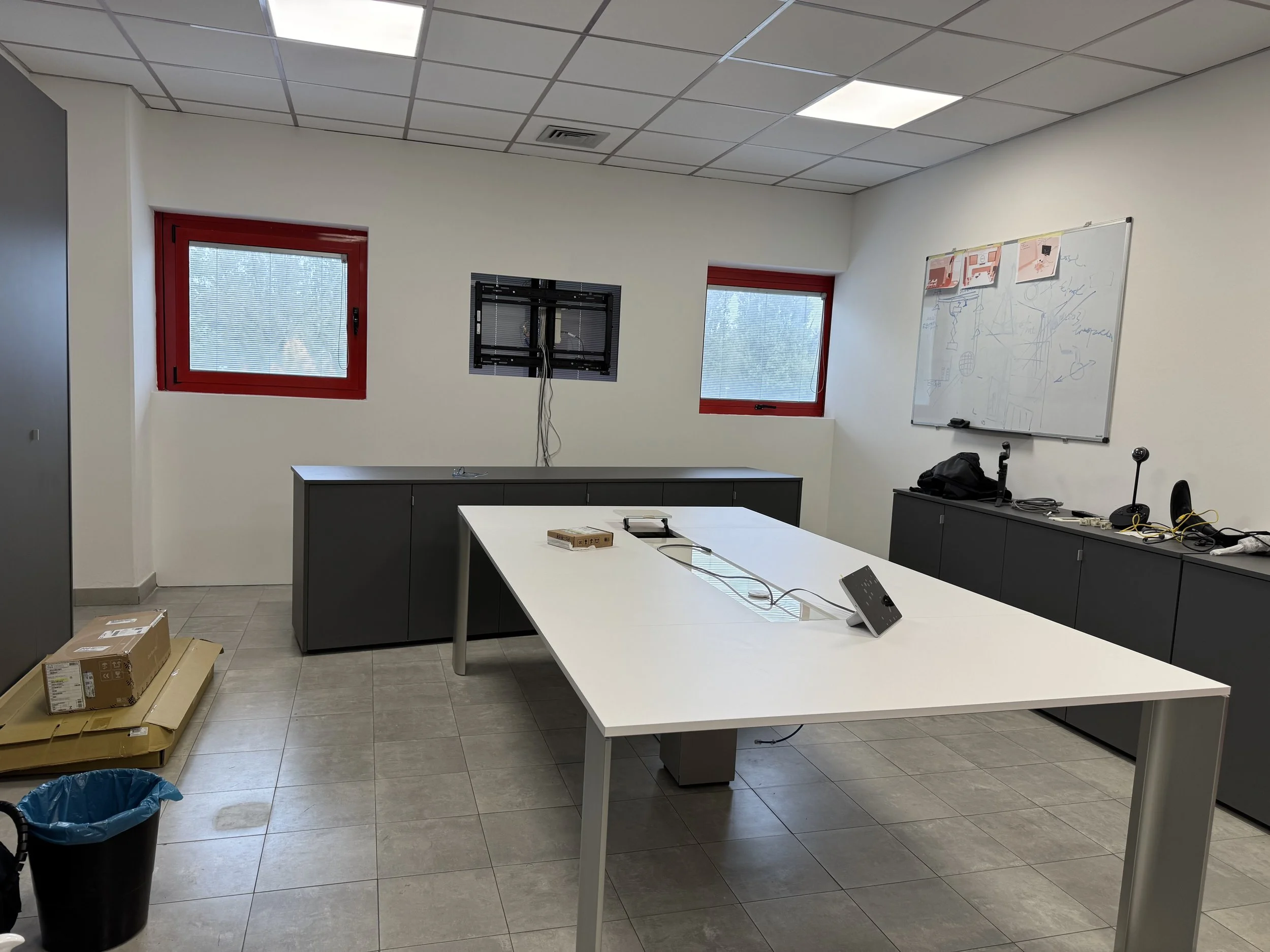 Per quanto riguarda la tecnologia, è stato installato un monitor Sony Professional da 98” su staffe Push-pull, che assicura una visione chiara e coinvolgente delle presentazioni. I sistemi di videoconferenza, come l'HP Poly 70, permettono comunicazioni fluide anche a distanza, mentre il microfono di espansione posizionato strategicamente sul tavolo garantisce un audio di alta qualità durante le discussioni.